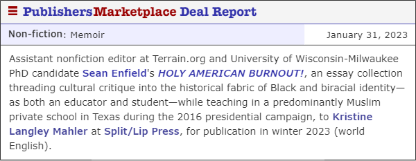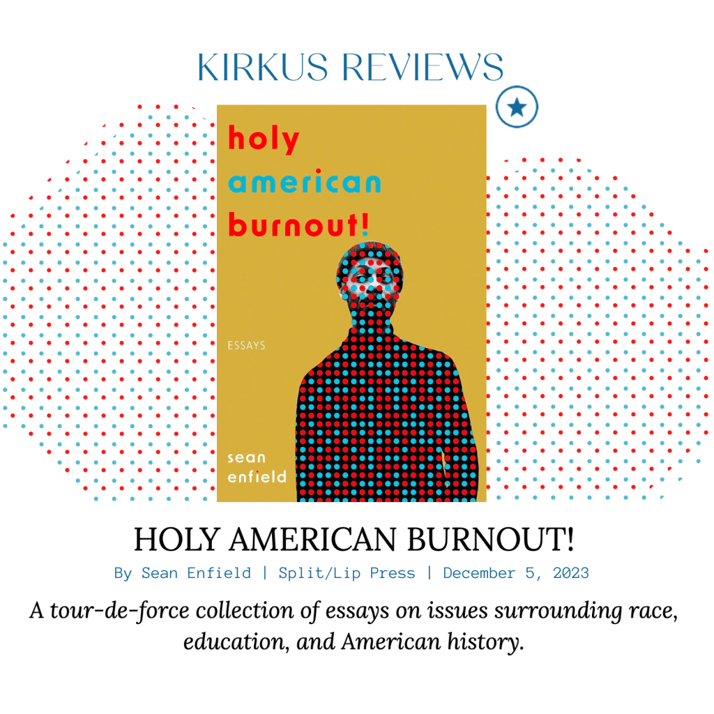 “In Holy American Burnout!, his urgent and insightful debut essay collection, Sean Enfield shares tales as varied as finding connections in churches and moshpits as well as teaching at a Muslim middle school. Enfield shows us what white supremacy looks like from the liminal vantage of a biracial kid coming of age in the aughts in Texas. He tells us facts we should know and reminds us truths we shouldn’t forget. These formally engaging essays are at turns vulnerable, poignant, and funny, and Enfield always shows wise care for those in his essays, his readers, and himself. Holy American Burnout! introduces a new necessary voice, and I’m immensely grateful for that.” — Sean Hill, author of Dangerous Goods and Blood Ties & Brown Liquor